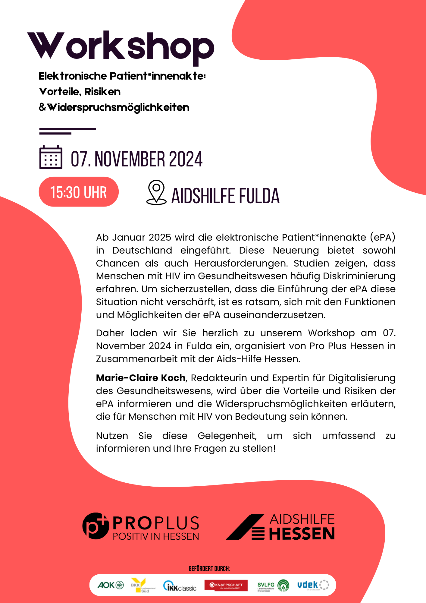 Daher laden wir Sie herzlich zu unserem Workshop am 07. November 2024 in Fulda ein, organisiert von Pro Plus Hessen in Zusammenarbeit mit der Aids-Hilfe Hessen.